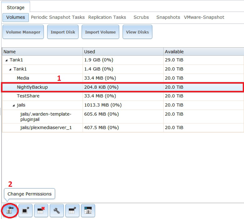 Remain on this screen and select the newly created dataset (1) if it is not selected already (in Fester’s case this was NightlyBackup).