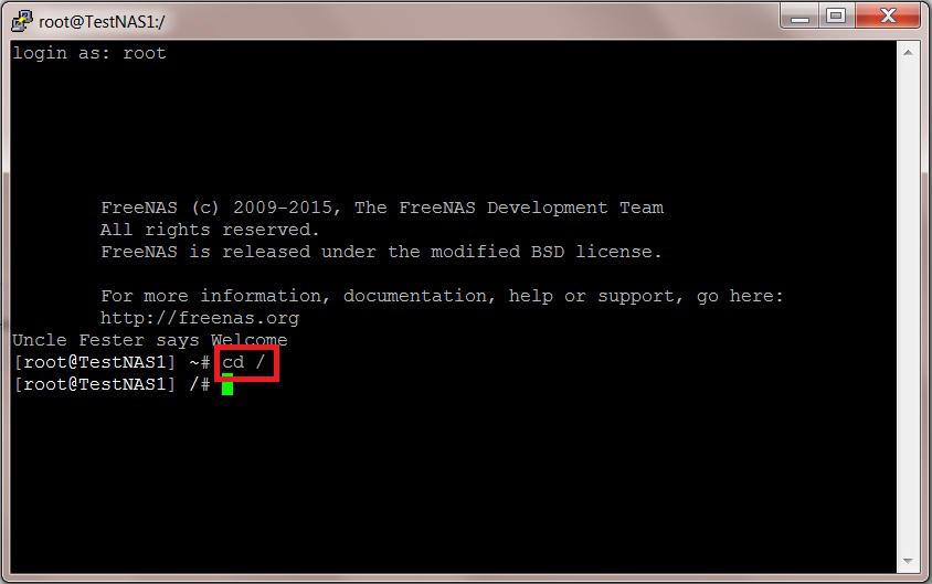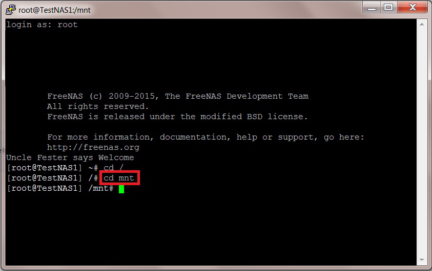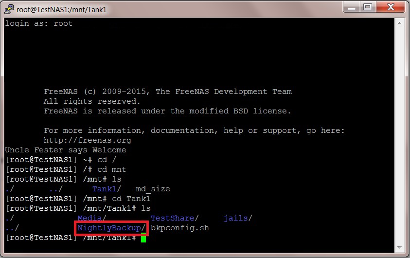 We now need to navigate to the dataset you created to hold the nightly backups by typing in the following command into the command prompt. Don’t forget to hit the “Return/Enter” key to execute the command.