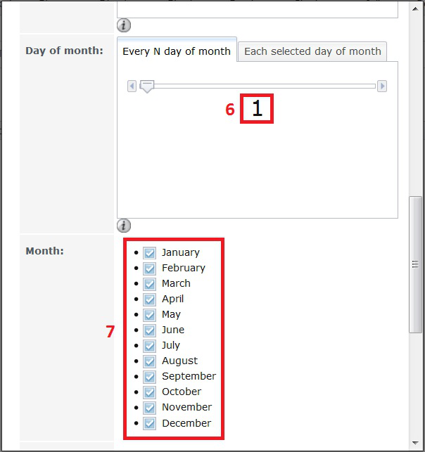 In the “Every N day of month” setting of the “Day of month:” section set this to 1 (6).
