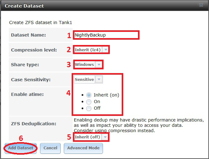 • “ZFS Deduplication:” should be set to off in the drop down selection box (5) unless you understand this and you have plenty of memory.