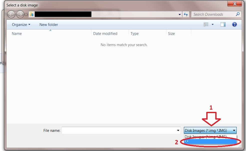 If you cannot see the image file and you know you are in the correct location then click on the drop down selector that determines the file type to be displayed (1) (this will likely be initially set to display only IMG files, if your image is in the form of an ISO file it won’t be shown) and chose the wild card “*.*” (2) this will display all files present.