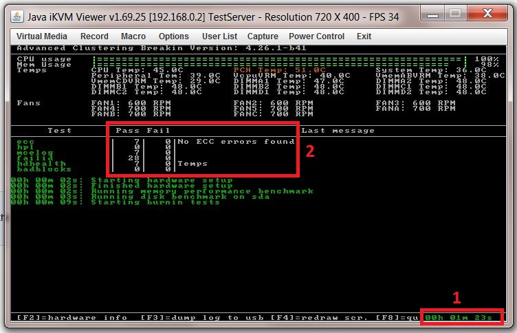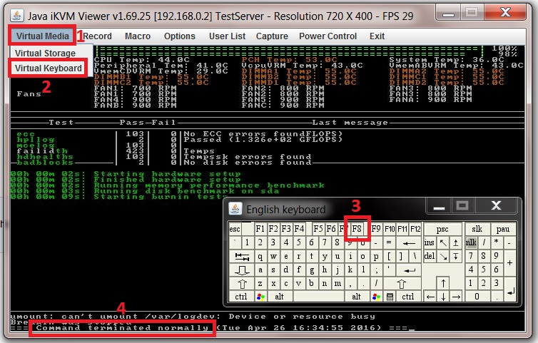 If at any point you need to stop the test open the virtual keyboard by selecting “Virtual Media” (1) from the drop down menus along the top of the iKVM Viewer. Now select “Virtual Keyboard” (2) and click with your mouse on F8 of the virtual keyboard (3).