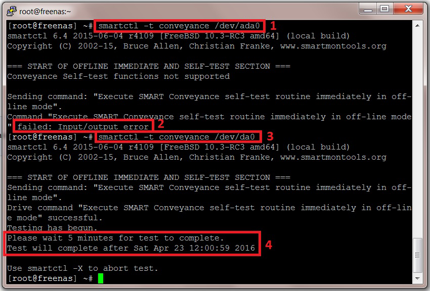 So at the command prompt enter the command to start the SMART conveyance test for the next drive in your system (in Fester’s case this is da1, the second storage drive).