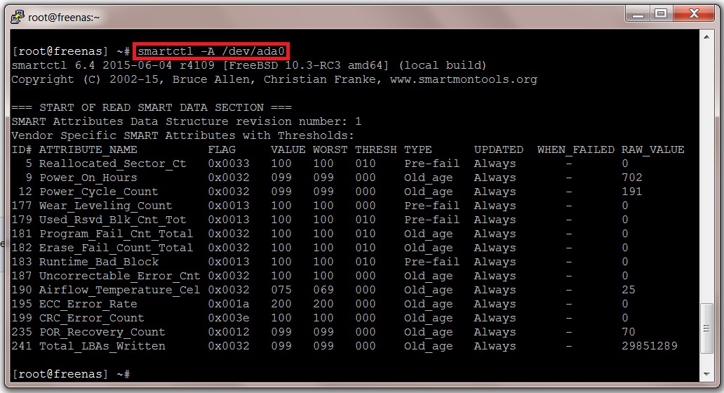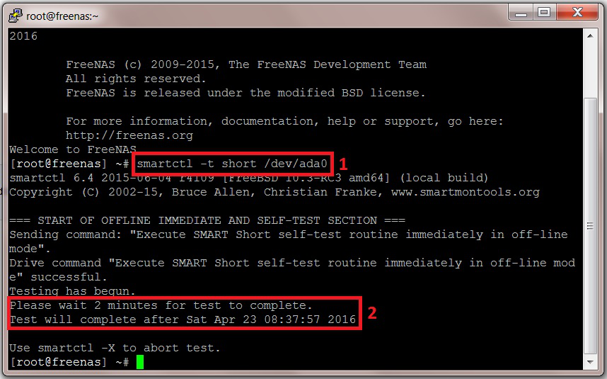 So at the command prompt enter the command to start the SMART short test for the next drive in your system (in Fester’s case this is da0, the first storage drive).