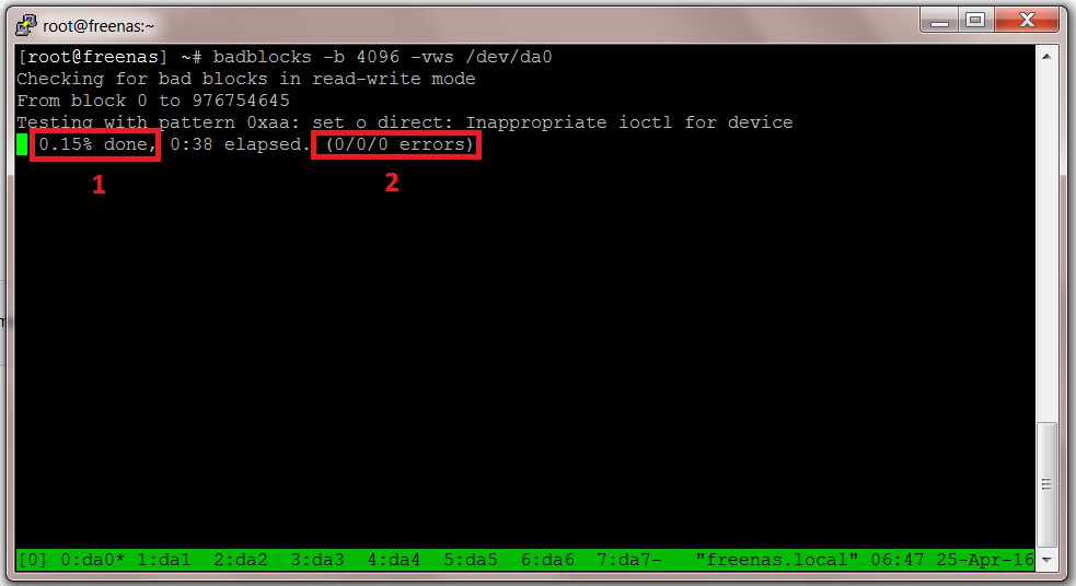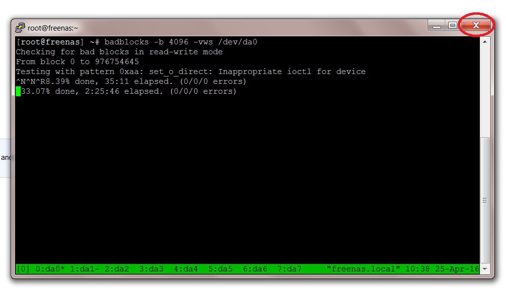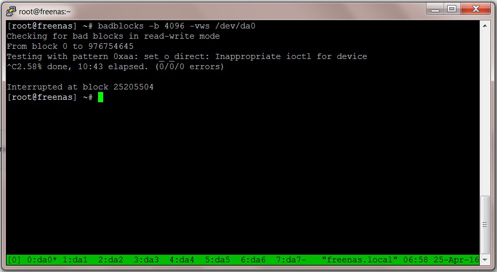 So when conducting these tests we will use tmux which is a session multiplexer built into FreeNAS. A session multiplexer is a console that is capable of running more than one session at the same time. This means we can now run multiple instances of Badblocks in parallel on different drives (this reduces the 24 days to just 3 days).