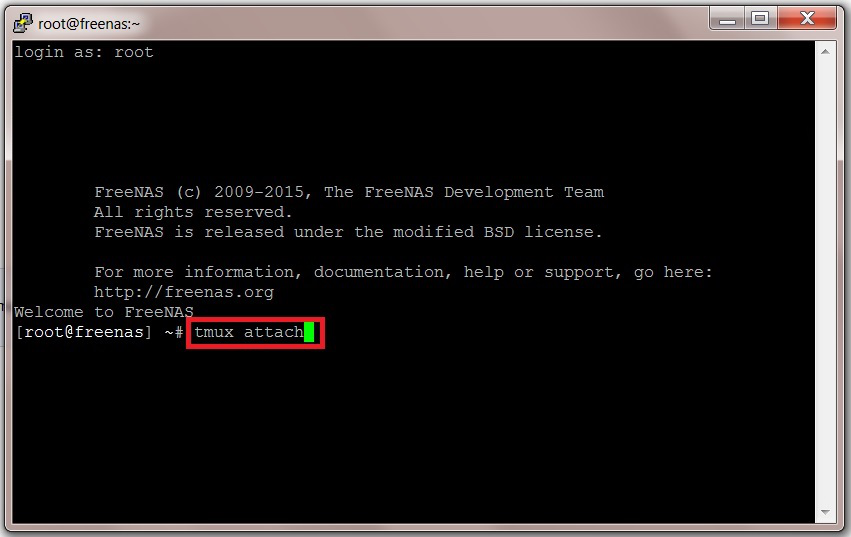Also when we close the SSH console, tmux on the FreeNAS system is kept open. It only closes properly when we formerly exit the tmux session. This means we do not need to keep the SSH console open for 3 days on the client computer (very convenient).