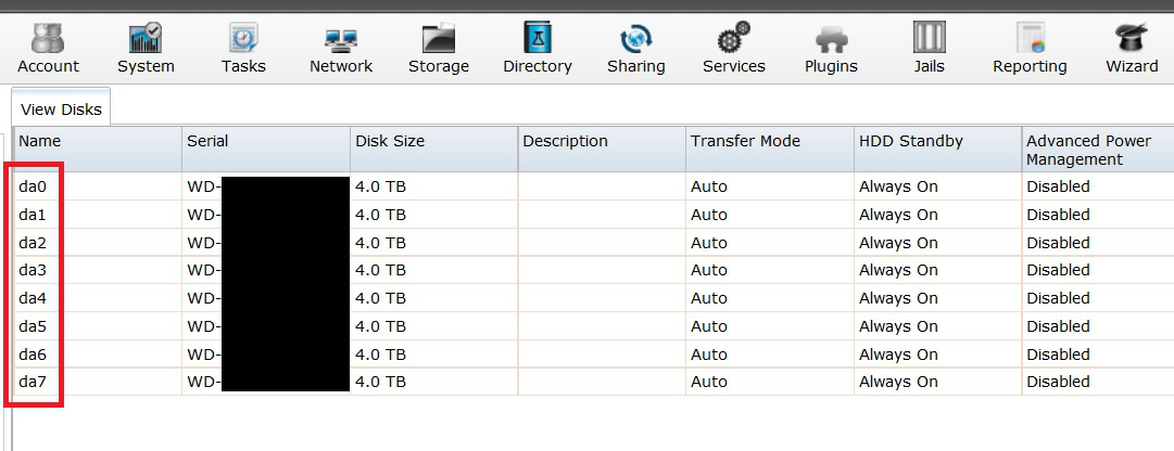 Incidentally, the name FreeNAS gives the OS HDD is ada0. If you have two OS drives (i.e. a mirrored configuration) this would be ada0 and ada1 respectively.