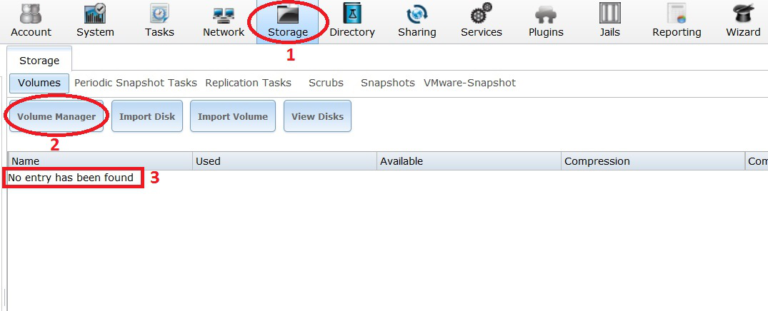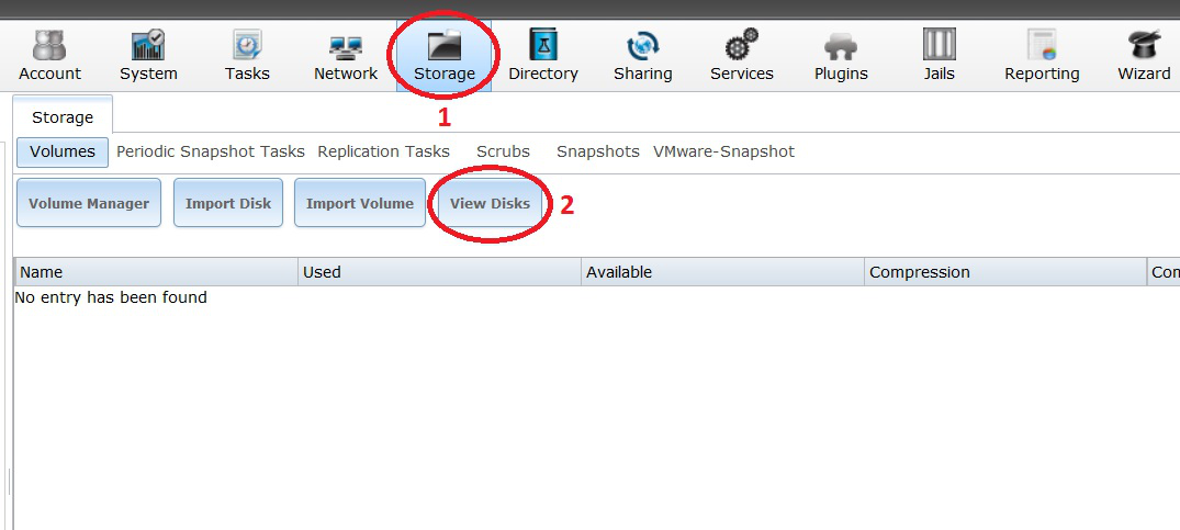 Go to the “Storage” page (1) and click the “View Disks” button (2).