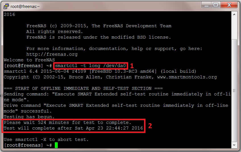 So at the command prompt enter the command to start the SMART long test for the next drive in your system (in Fester’s case this is da1, the second storage drive).