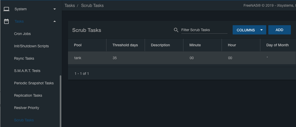 You'll see that a default scrub task has been created for your pool, set to run every 35 days at midnight on Saturday. Unless you have a very high resolution monitor (and a very large browser window), you'll need to scroll sideways on the scrub schedule itself to see the rest of this information. There's no obvious visual indication on the screen that this is necessary, but it is. It will look like this when scrolled to the right: