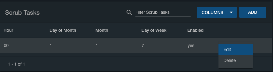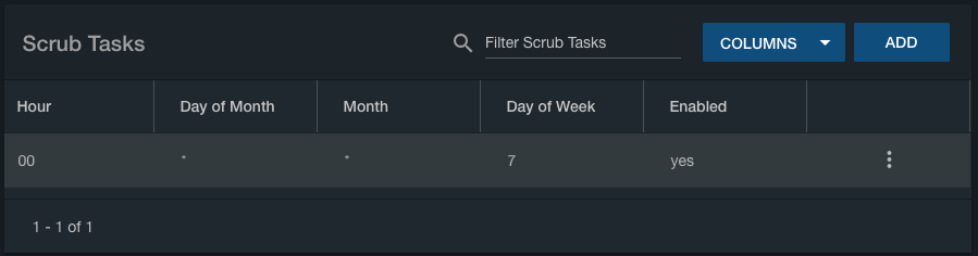 You can edit the default scrub schedule by clicking on the three vertical dots to the far right, then “Edit” in the pop-up menu, and populating the settings within with new ones that will follow shortly.