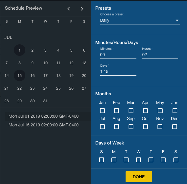 - You'll see a scheduling window pop up. Under the heading of Minutes/Hours/Days, enter 00 for Minutes, 02 for Hours, and 1,15 for days.