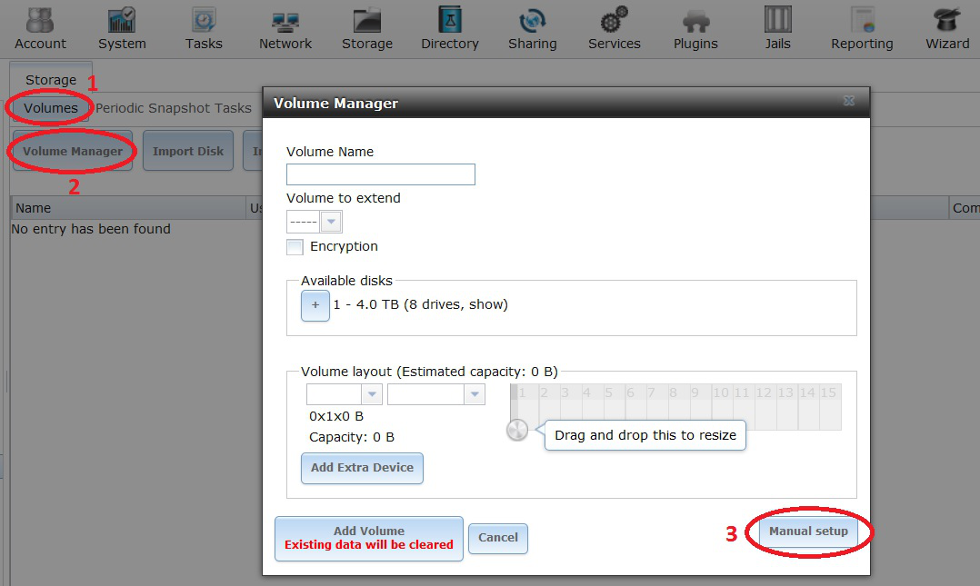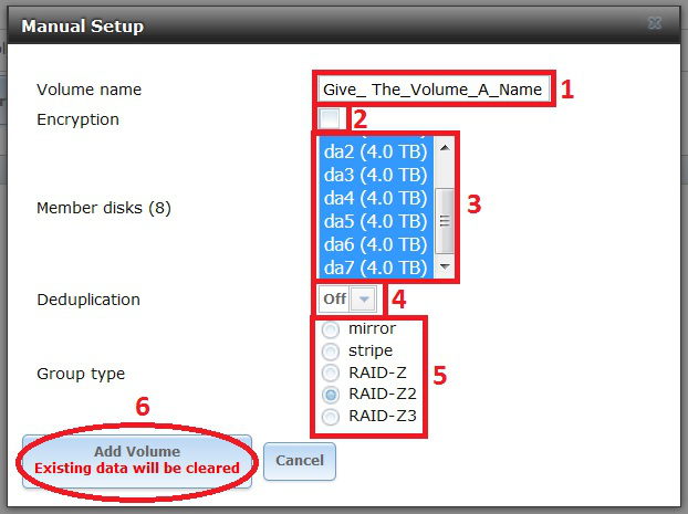Give your volume a name in the “Volume name” text box (1). If you cannot think of anything then “Tank” seems to be popular amongst FreeNAS users (I don’t know why?).