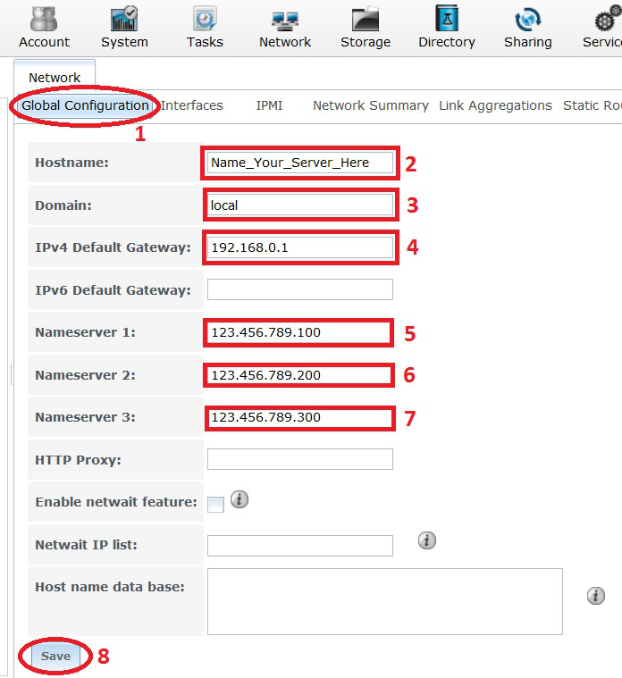 - Your server will most likely be on your private network behind the router so the “Domain:” should be “local” (3).