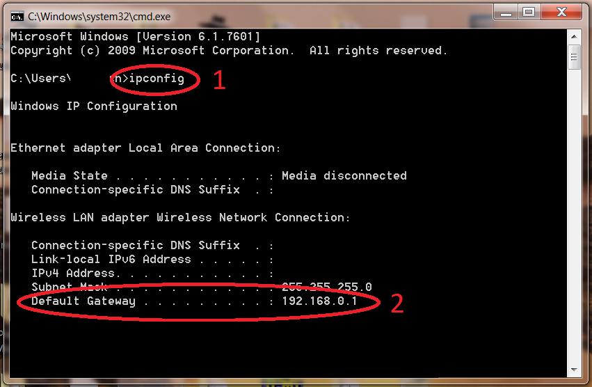 Type in ipconfig at the command prompt (1) and then note down the Default Gateway IP address (2), you should get something like this.
