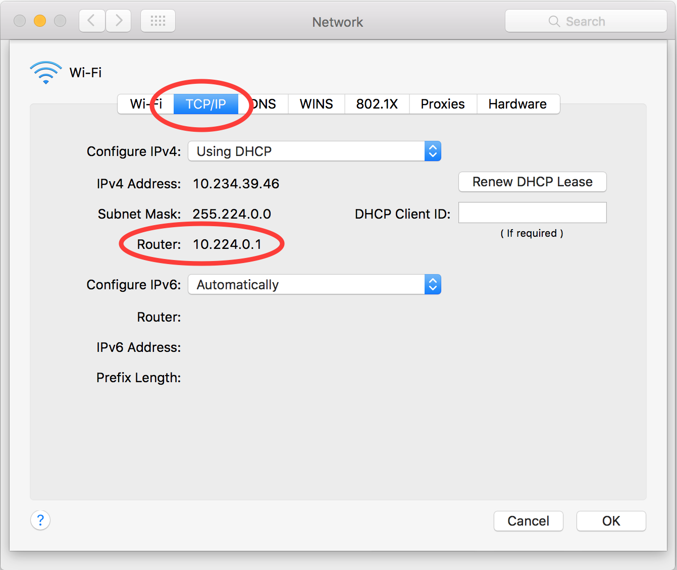 Select the “TCP/IP” tab on the next screen, and go down the list (it’s usually down the bottom) until you come to an entry called “Router”. The associated IP address is the one you want.