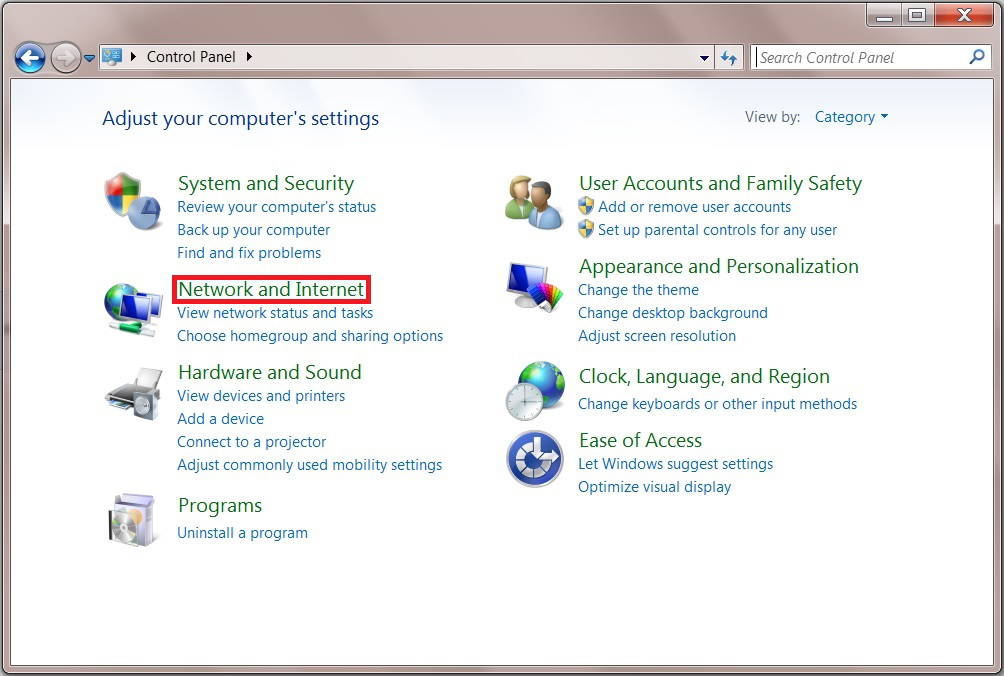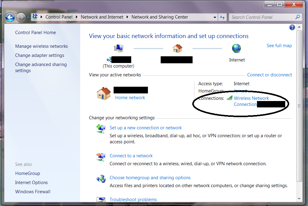 Click on the “Start” button and go into the “Control Panel” in Windows and select “Network and Sharing Centre” (this was on a Windows 7 machine).