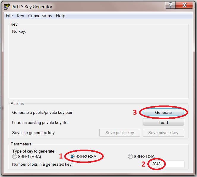 When the PuTTYgen window appears check “SSH-2 RSA” is selected (1), if it isn’t select it.