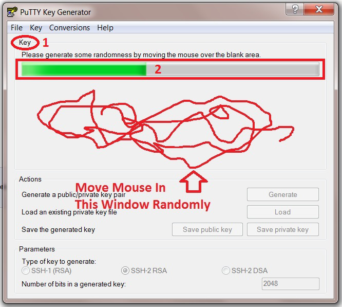 Now move your mouse in a random way within the box labelled “Key” (1) in PuTTYgen until the green bar fills up (2).