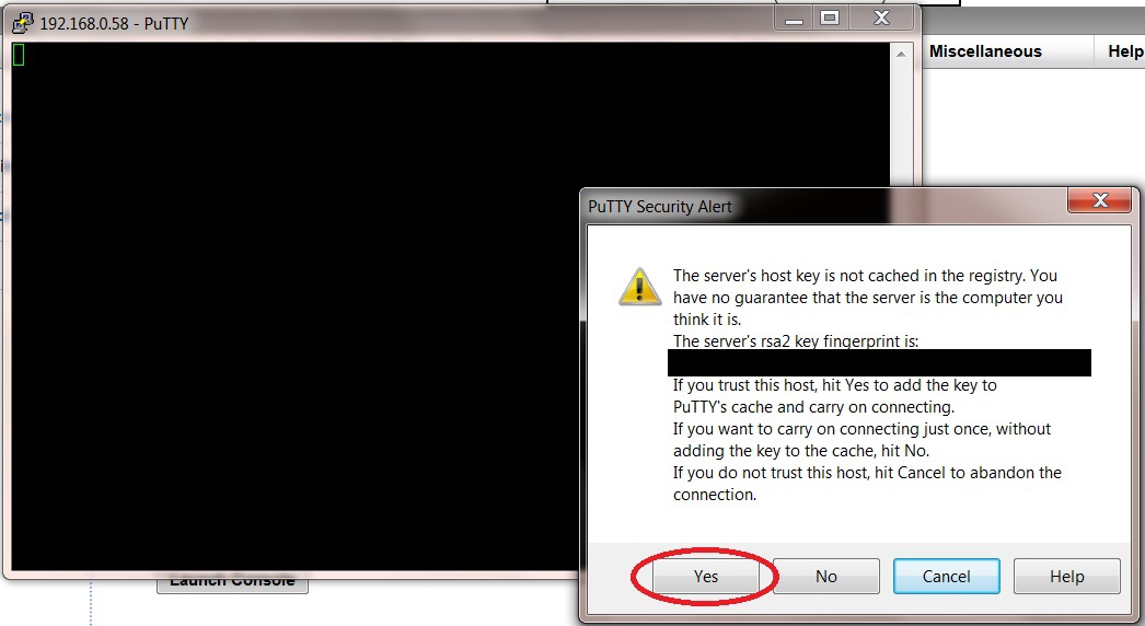 A PuTTY security alert window should now open. It will show the server’s RSA2 key fingerprint and will ask if you trust this host before allowing the connection. Click the “Yes” button.