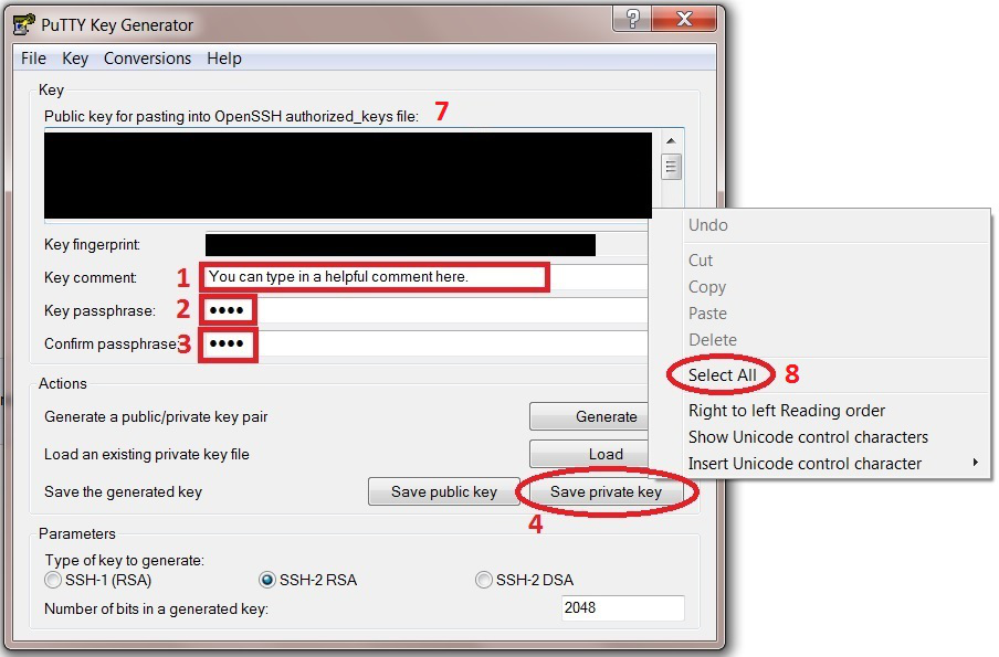Now right click in the “Public key for pasting into OpenSSH authorized_keys file:” window (7) and from the pop up submenu chose “Select All” (8).