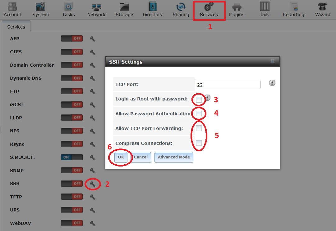 - If you do not want the root user to be able to log in using only a password (i.e., if you want to require a public key, or if you don't want the root user to be able to log in remotely at all), uncheck the “Login as Root with password” tick box (3).