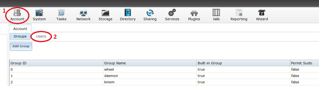 If you have required public key authentication in the SSH configuration, you'll need to tell FreeNAS what the public key is for each user who will be connecting via SSH. To do that, Navigate to the “Account” page by clicking on the Account icon (1). Now click on the “Users” button (2).