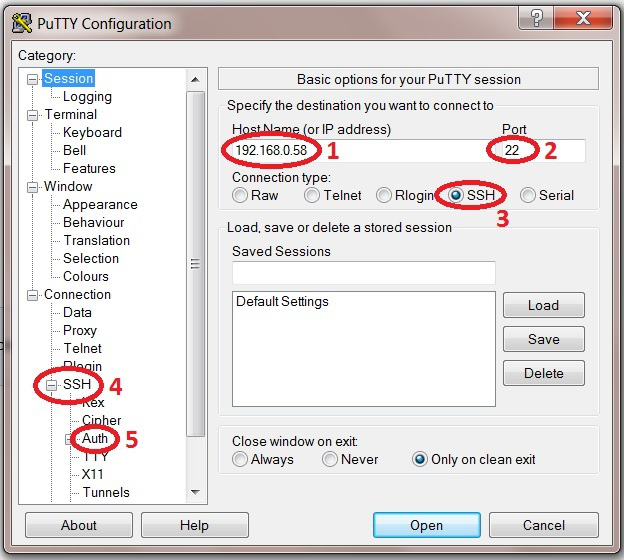 Now click on the “Open” button (5) to start the session (have the password you created in PuTTYgen standing by).