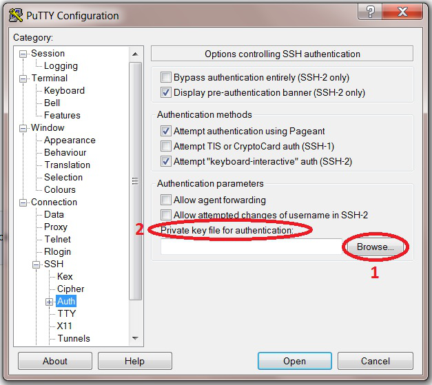 On this screen click the “Browse” (1) button next to the “private key file for authentication:” (2).