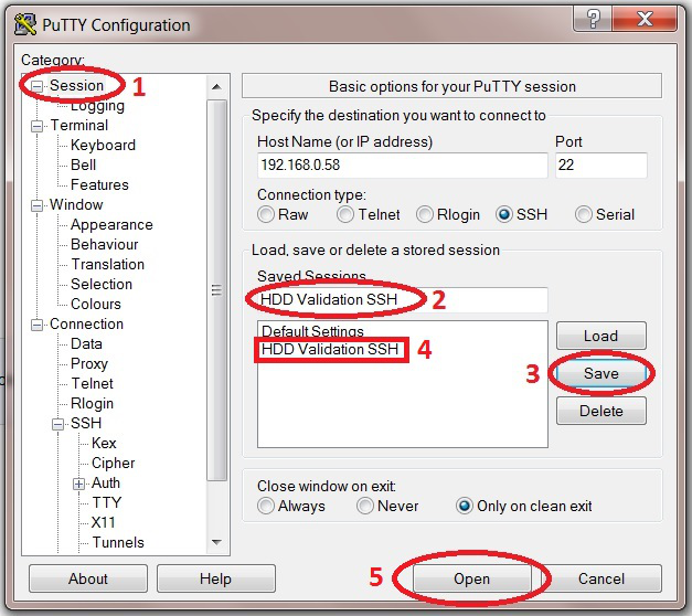 In the “Saved Sessions” box (2) type a good name for the session (Fester called it “HDD Validation SSH”).