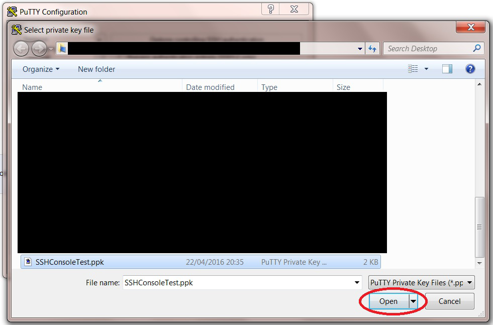 This will bring up a window in which you can load in the private key into PuTTY. Navigate to where you stored the private key, click on it and then click the “Open” button.