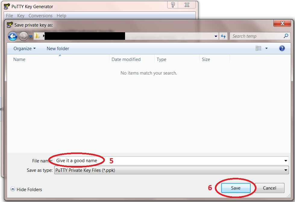An additional window will pop up, navigate to where you would like to save the key, give it a name (5) and click the “Save” button (6). Save it somewhere convenient as this will be needed soon.