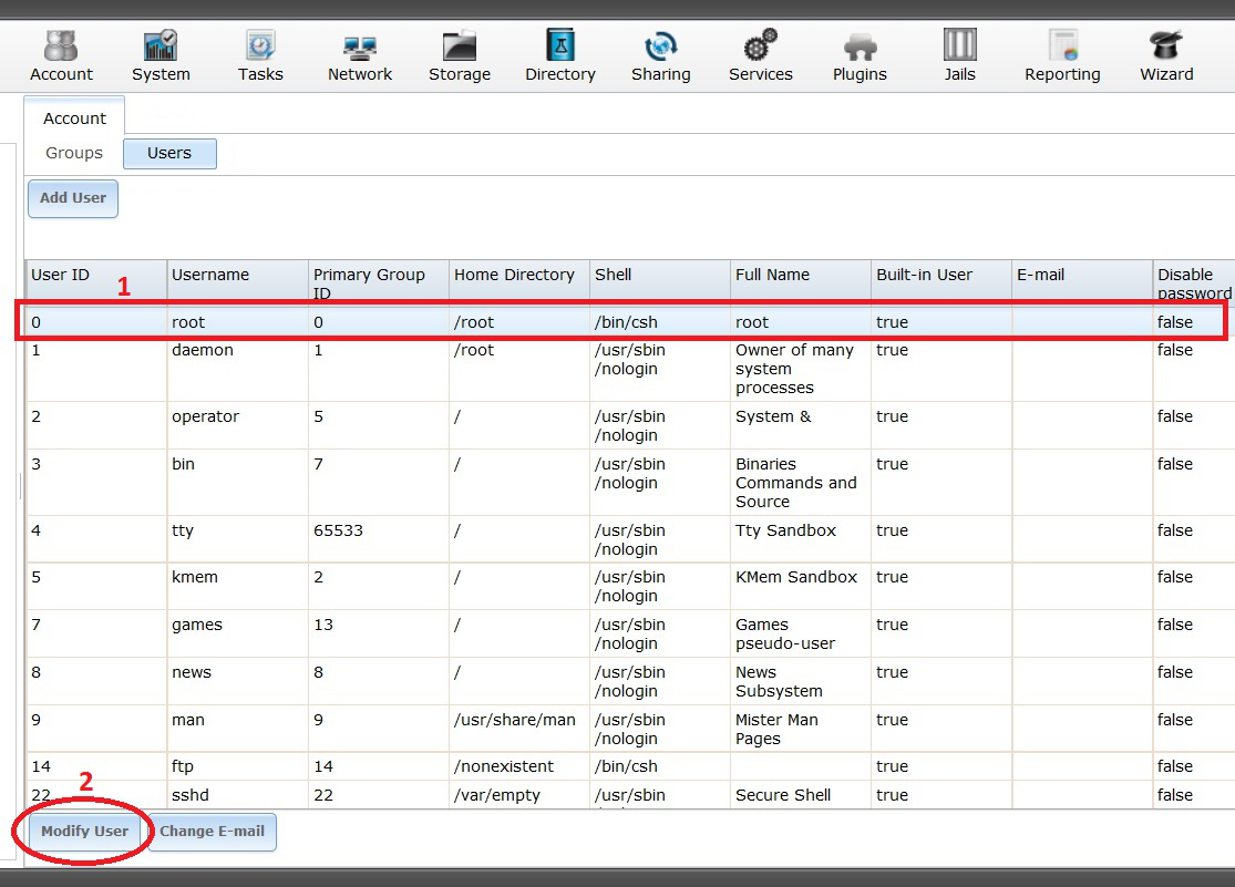 Now select the “root” user account (1) (it will turn blue when selected) and click on the “Modify User” button (2).